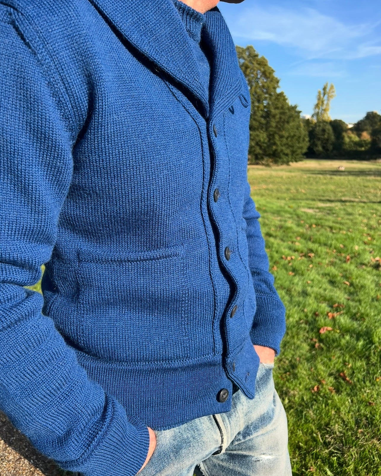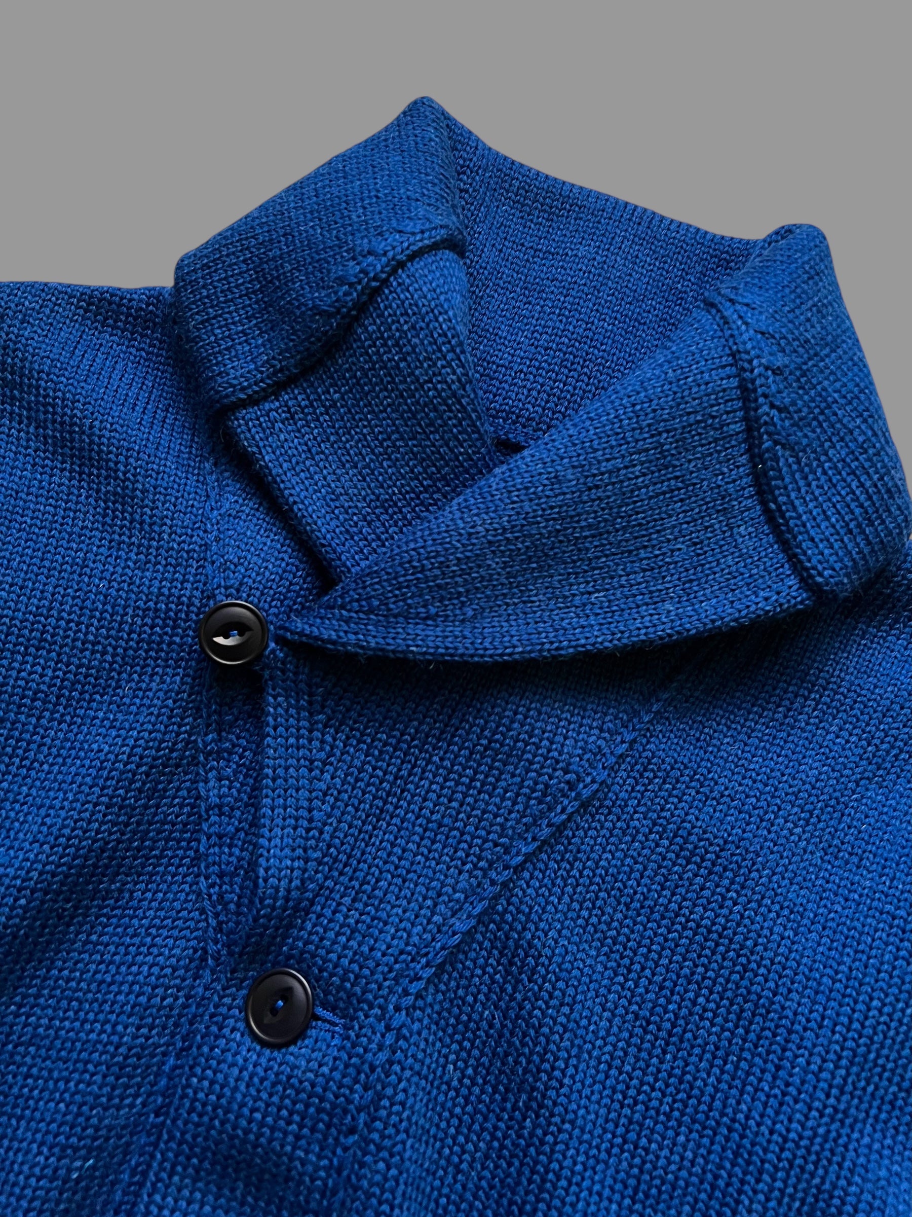 Our Frontier cardigan with an updated shawl collar design, and extra button and loop for a snug collar closure.