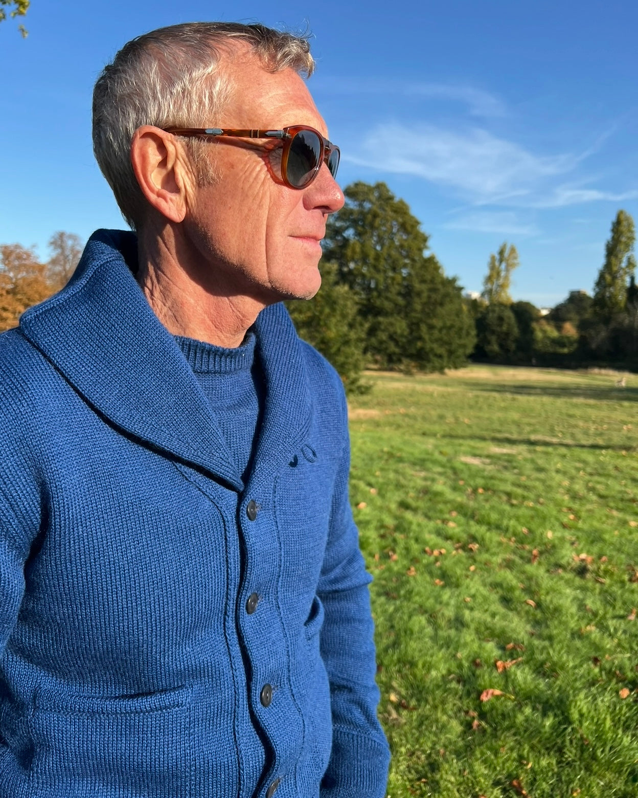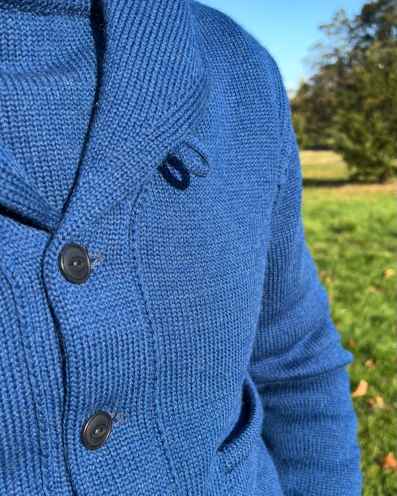 Our new Frontier cardigan with an updated shawl collar design, and extra button and loop for a snug collar closure.